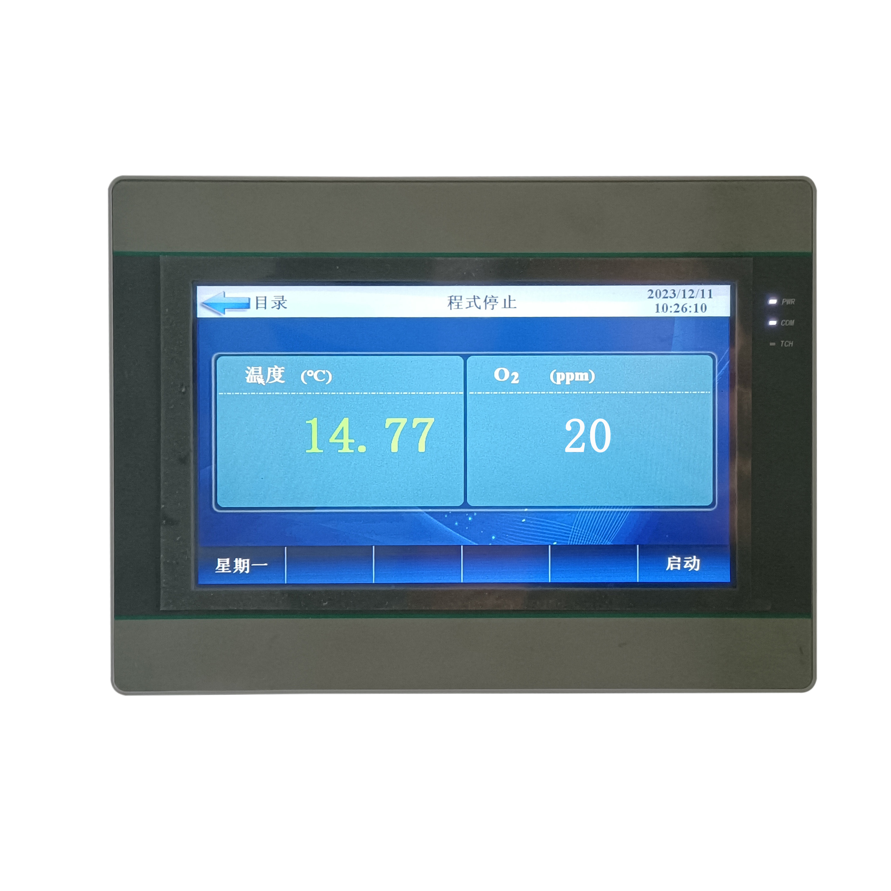 溫度控制器 | 采用PLC系統,7寸觸摸屏控制 、具備多組PID加自適應控制可編程100個溫度階梯與升溫與保溫時間、O2濃度保持,運行數據保護與實時查詢 控制器操作界面設中英文可供選擇 |